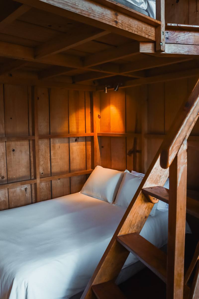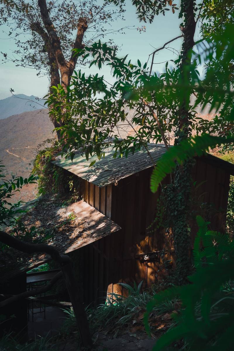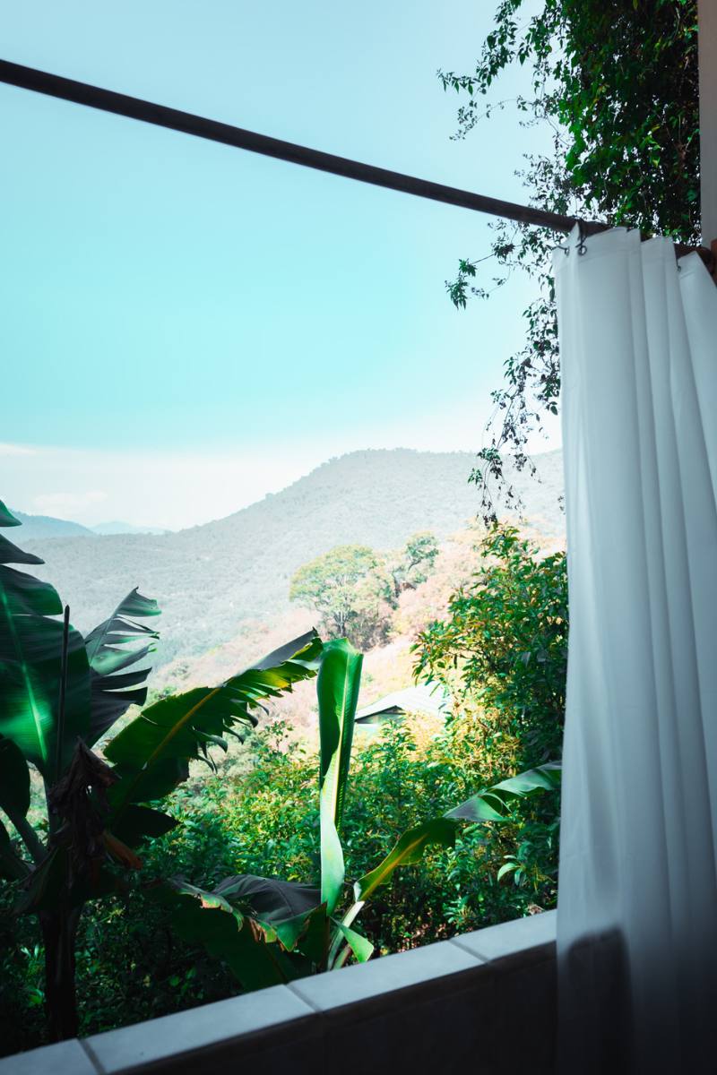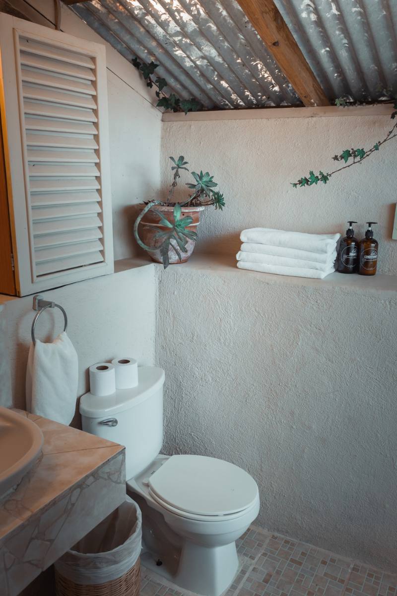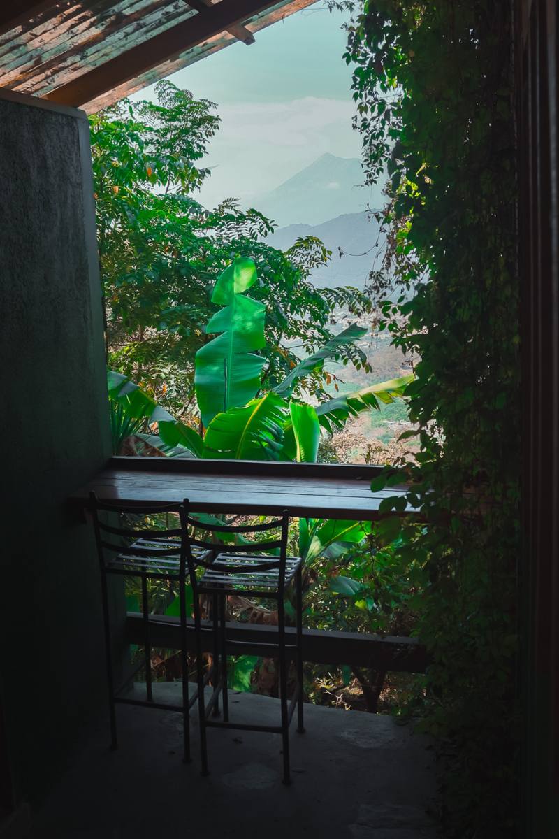 One of our larger Premium Accommodations, El Sueco Tree House features two levels, one double bed on each level, and private bathroom and shower (with hot water of course). This real live tree house can accommodate up to 4 guests. Please note that the second level loft is accessed via an indoor ladder. This is an authentic tree house, built around a living oak tree that comes up through the land and out through the roof. Let your tree house dreams finally come true! This beautiful tree house features huge two story windows for stunning views of the volcanoes! El Sueco Treehouse also includes a private outdoor lounge space with a hightop bar and stools perfect for journaling, working, or enjoying a beverage in the privacy of your own space. To access El Sueco Tree House you will need to walk down a steep dirt path off the main walking path about 100 meters. In all of our guest accommodations you will find complimentary bath towels, eco-friendly locally made bath products, and handcrafted Guatemala textiles.